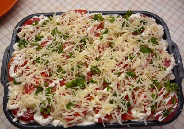 A karfiolt tíz percen át sós vízben főzzük, leszűrjük, apróra törjük. A csirkemellet szintén sós vízben főzzük, felszeleteljük. A hagymát karikára vágjuk, a paradicsomot felaprítjuk. A tejfölt összekeverjük a felvert tojásokkal, fűszerezés után pedig mehet bele a zúzott fokhagyma.