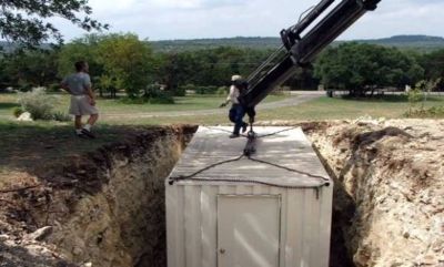 Ezután egy jókora gödröt ásott a földbe, az volt a lényeg, hogy fél méterrel mélyebb legyen, mint a konténer. Ezután következett 15 cm tőzegkavics a gödör aljára. Ez könnyíti a víz elfolyását a gödörből. A konténert egy bérelt daru segítségével helyzeték a gödörbe.