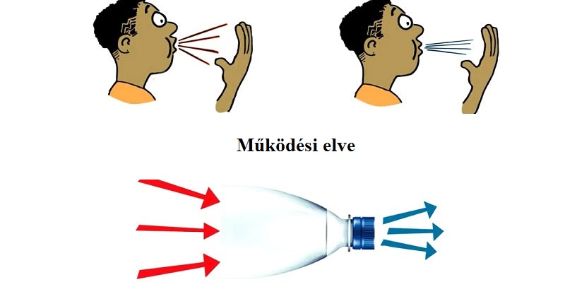 A videóban láthatjuk, hogyan is kellene kinéznie. Az előzőleg elvágott műanyag flakonokat beletesszük a kivágott kis körökbe, és ragasztószalaggal rögzítjük. Szilikonpisztollyal rögzítjük a flakonokat, hogy még stabilabban álljanak. Minden egyes flakon között két lyukat vágunk, és műanyag bilincset helyezünk bele, ezzel rögzítjük majd a ventilátorra. Levágjuk a műanyag bilincs szabad részét, és készen van a szerkezetünk, amely a videóban is látható. A ventilátor az alábbi elven működik: