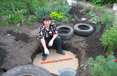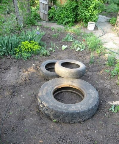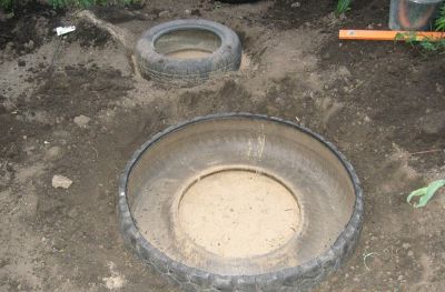 Ássunk három gödröt a három gumi számára, és az alját borítsuk homokkal:
