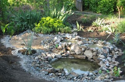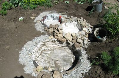 Helyezzünk köveket, növényeket a gumik köré. Töltsünk vizet a kibélelt gumikba. Csodálatos kerti tavat kaptunk!