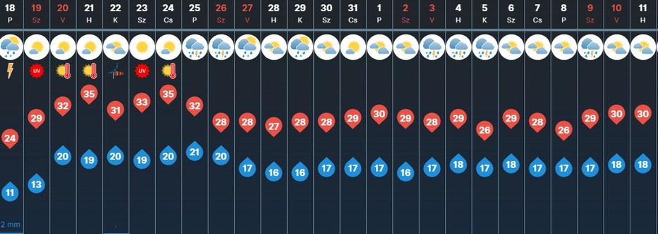 Szombaton a hőmérséklet 26-32 fok között alakulhat, míg vasárnap már 29 és 34 fok közötti csúcshőmérsékletekre számíthatunk. A légmozgás csak zivatarok környezetében erősödhet fel, így a napok viszonylag nyugodtnak ígérkeznek.