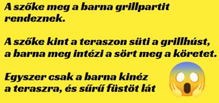 A szőke meg a barna grillpartit rendeznek. A vendégek már szállingóznak, a szőke kint a teraszon süti a grillhúst, a barna meg intézi a sört meg a köretet. Egyszer csak a barna kinéz a teraszra, és azt látja, hogy éppen szénné ég a grillhús, már egyenesen füstöl. Ezalatt pedig a szőke nyugodtan dumál a vendégekkel. … Bővebben: VICC: A szőke meg a barna grillpartit rendeznek