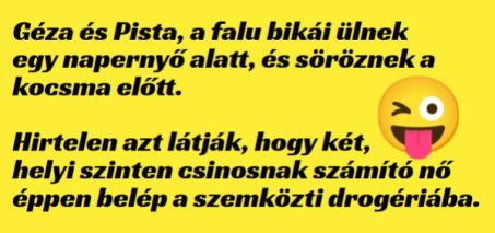 Géza és Pista, a falu bikái ülnek egy napernyő alatt, és söröznek a kocsma előtt. Hirtelen az utca másik végén szemközt látják, hogy két, helyi szinten csinosnak számító nő éppen belép a drogériába. Mondja az egyik férfi nagy büszkén a másiknak: – Te Géza, láttad azt a két nőt ott? Hirdetés – Láttam. – Na, … Bővebben: VICC: Géza és Pista, a falu bikái ülnek a kocsma előtt